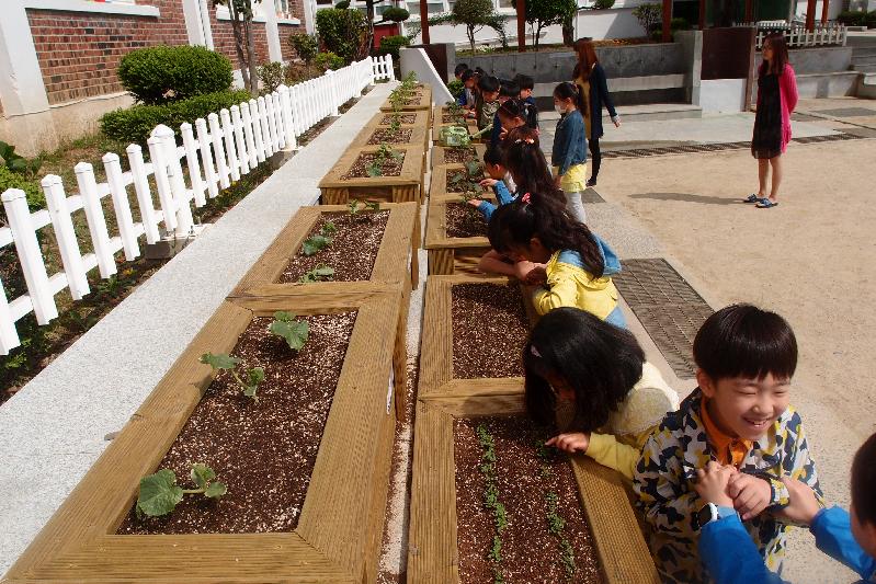 옥포초등학교에는 유휴부지가 거의 없기 때문에 장승포 농협에서 각 반별로 특수하게 제작된 간이 재배 상자 30개를 만들어 운동장 가장자리의 계단에 설치하였다. 또한 지난 25일 각 반별로 장승포 농협에서 보내온 고추, 오이, 토마토, 가지 등의 모종을 옮겨 심었으며, 상추, 근대 등은 씨앗을 뿌렸다.