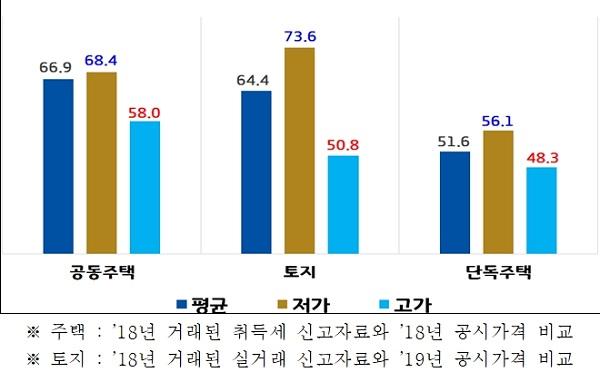 이런 현상은 부동산 가격 구간별로도 나타나는데 실거래가 9억 원 이상 주택과 3억 원 이하 주택의 시세반영률을 비교한 경기도 조사에 따르면 단독주택은 9억원 이상 48.3%, 3억원 이하 56.1% 아파트 9억원 이상 58%, 3억원 이하 68.4%로 나타났다. 토지도 마찬가지여서 ㎡당 3백만원 이상은 50.8%, 10만원 이하는 73.6%로 가격이 낮을수록 더 높은 과세기준 적용을 받게 된다.