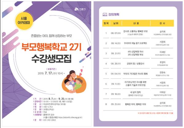 시흥시는 오는 8월 7일부터 9월 25일까지 총 8회에 걸쳐 부모행복학교 2기를 운영한다.