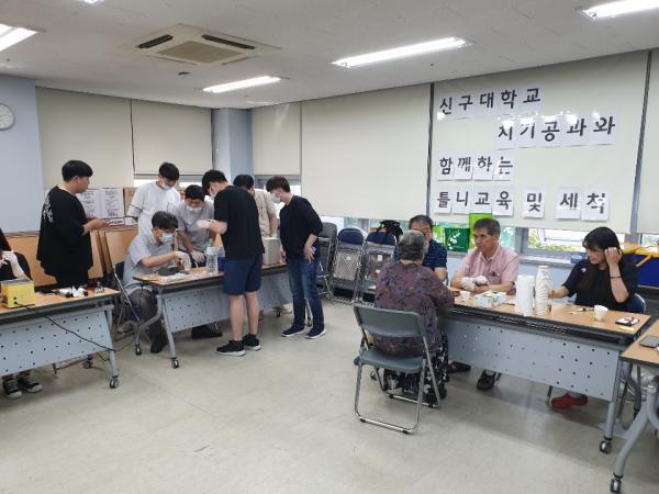 이번 무료 틀니검진은 신구대학교 치기공과와 연계해 노년기 구강건강관리를 위해 마련됐으며 신구대학교 치기공과 교수 5명과 학생 10여명은 정기적인 틀니 검진 및 수리와 올바른 틀니사용법 및 관리요령, 세척방법 등에 대한 교육을 통해 틀니 상태를 개선하고 적극적인 유지관리를 진행할 수 있도록 도왔다.