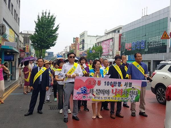 부모사랑 효문화 거리캠페인 행사는 사)전북노인복지효문화연구원의 대표사업으로 11년째 도내 지역을 순회하며 시행되는 캠페인 활동이다.
