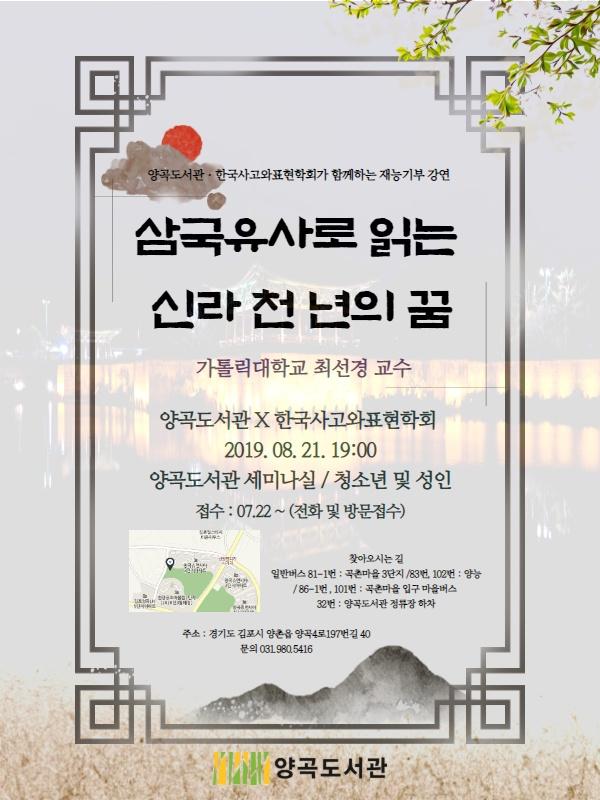 김포시 양곡도서관은 오는 8월 21일 청소년과 성인을 대상으로 재능기부 강연회 “삼국유사로 읽는 신라 천 년의 꿈”을 개최한다.