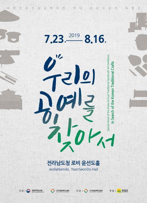 문화재청 국립무형유산원이 주최하고 국가무형문화재기능협회가 주관하며 전라남도청이 후원하는 ‘대한민국전승공예대전 역대 본상수상작 특별전’ ‘우리의 공예를 찾아서’가 오는 23일 개막식을 시작으로 8월 16일까지 전라남도청 로비 윤선도홀에서 개최된다.