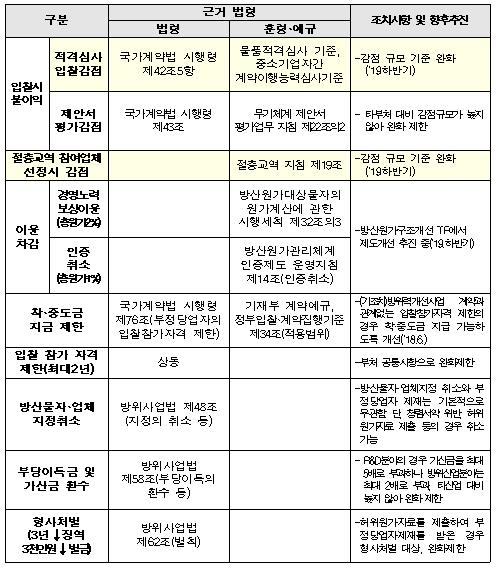 특히 부정당업자의 적격심사 감점과 절충교역 참여업체 선정 시 감점의 경우, 이미 부정당업자 제재를 받은 업체에 추가적인 제재를 가한다는 의견이 많았다. 이에 따라 제재 항목을 유지해 부정당업자 제재의 취지는 유지하되 각각 기존 대비 절반 수준으로 감점 규모를 완화하기로 했다.