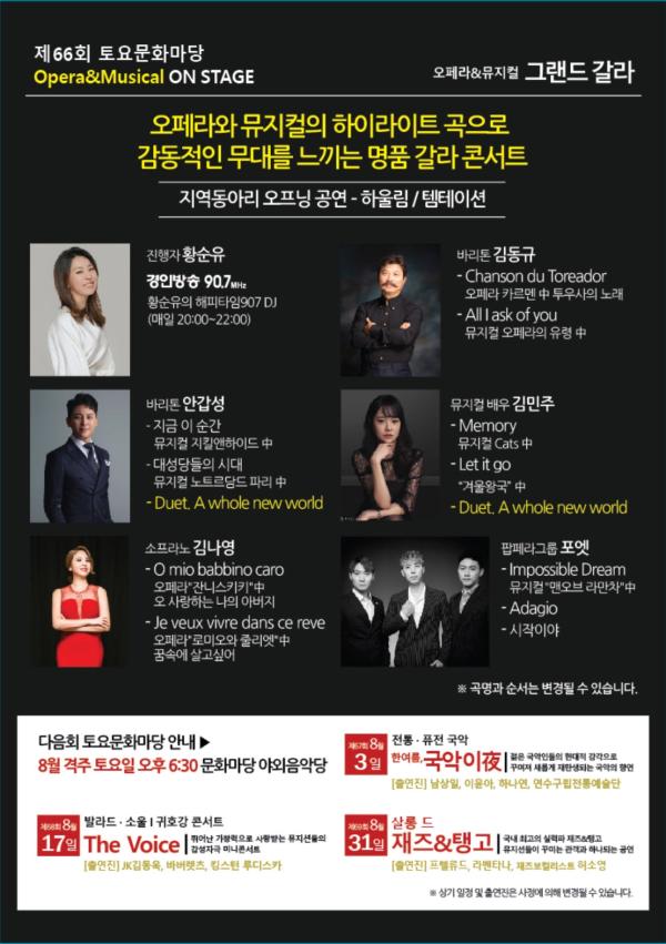 연수구는 오는 20일 저녁 6시 30분, 연수동 문화공원 야외음악당에서 Opera&Musical ON STAGE 라는 테마로 제66회 토요문화마당 “오페라&뮤지컬-그랜드 갈라”를 개최한다.
