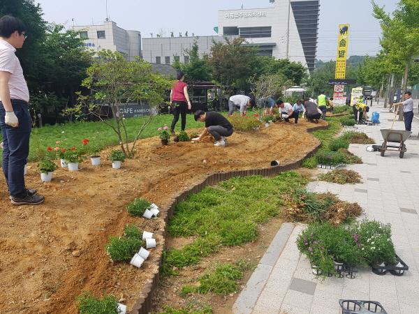 이날 읍 직원 40여명은 페라고늄, 아스타, 국화 등 여름꽃 500포기를 심었다.