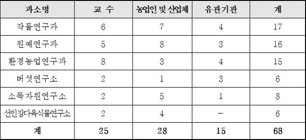 전문농업인, 산업체, 대학교수, 유관기관 등의 전문가와 함께 45개 과제와 167개 세부과제를 현장위주로 점검하고, 농업현장에 즉시 사용가능한 활용도 높은 연구 성과 도출을 위해 현장 의견을 수렴한다.
