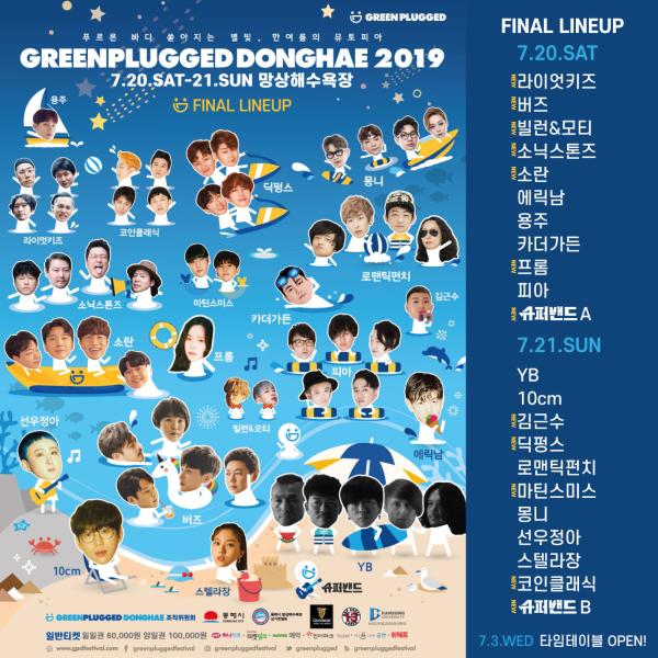 이번‘그린플러그드 동해 2019’에는 총22개팀의 아티스트가 참가하며 지난해보다 더 탄탄한 라인업을 자랑한다. 20일에는 버즈, 소란, 에릭남?등이 무대에 서고, 21일에는 국내 록밴드 YB, 10㎝, 선우정아,?딕펑스, 몽니,?로맨틱펀치 등이?다양한 장르의 음악을 들려줄 예정이다.
