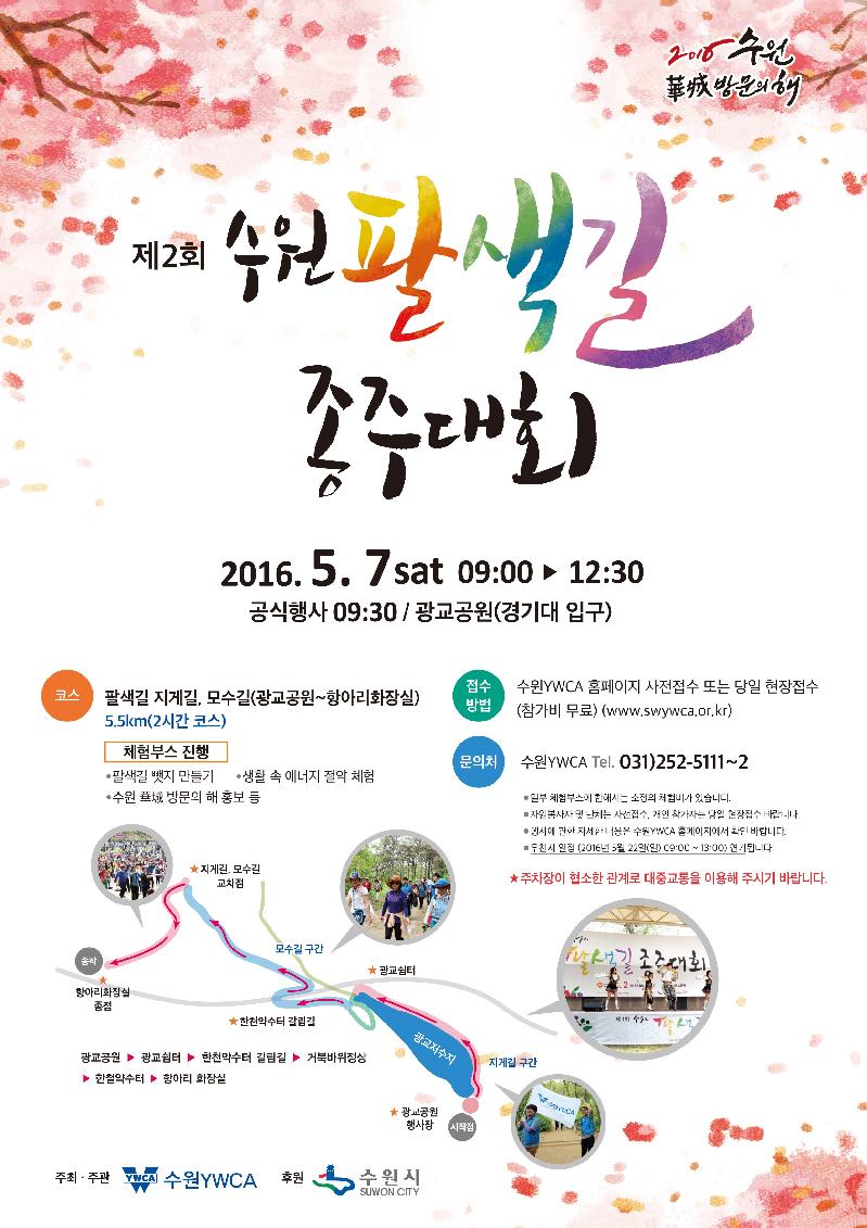 수원시와 수원YWCA가 주관하는 이번 대회는 지난해 1회 대회를 통해 알려진 팔색길 중 다양하게 조성, 개발된 길을 시민들에게 널리 알리기 위해 마련됐다.
