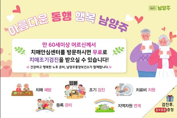 남양주풍양보건소에서는 만 60세 이상 남양주시 주민을 대상으로 치매조기검진을 무료로 실시하고 이에 따른 치매통합서비스를 제공한다.