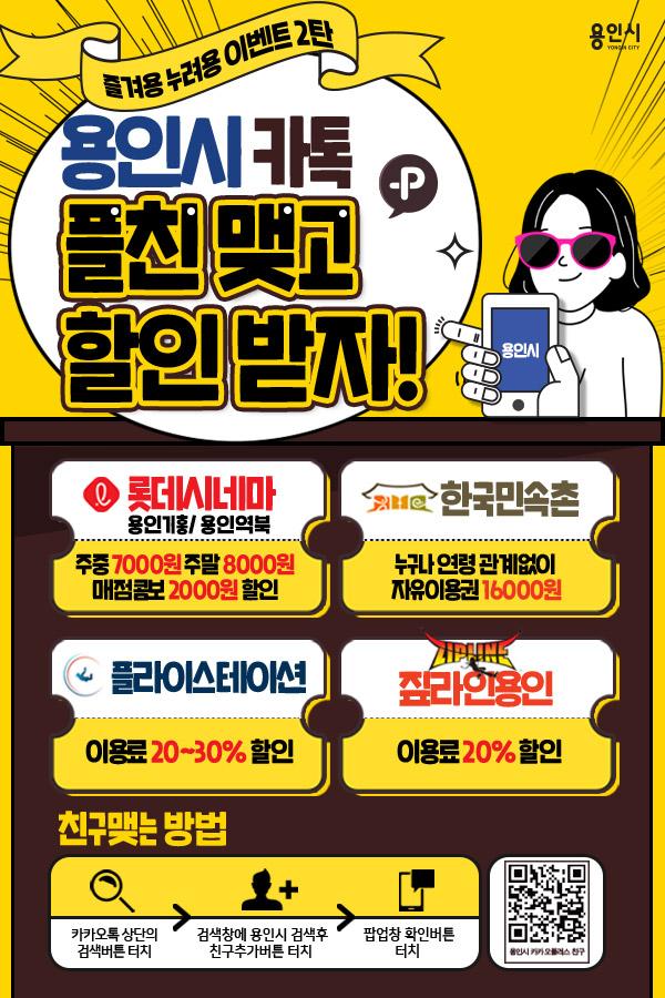 용인시가 시와 ‘카카오톡 플러스 친구’를 맺으면 문화·레저 등의 다양한 할인혜택을 제공하는 ‘2019 즐겨용 누려용 이벤트 2탄’을 22일부터 진행한다.