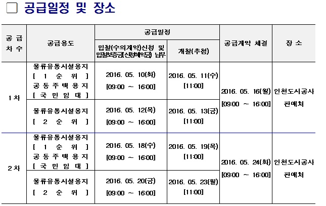 기타 공급관련 자세한 사항은 인천도시공사 홈페이지 「공지사항」에서 확인 가능하며, 판매1팀으로(032-260-5622, 5625) 문의하면 된다.