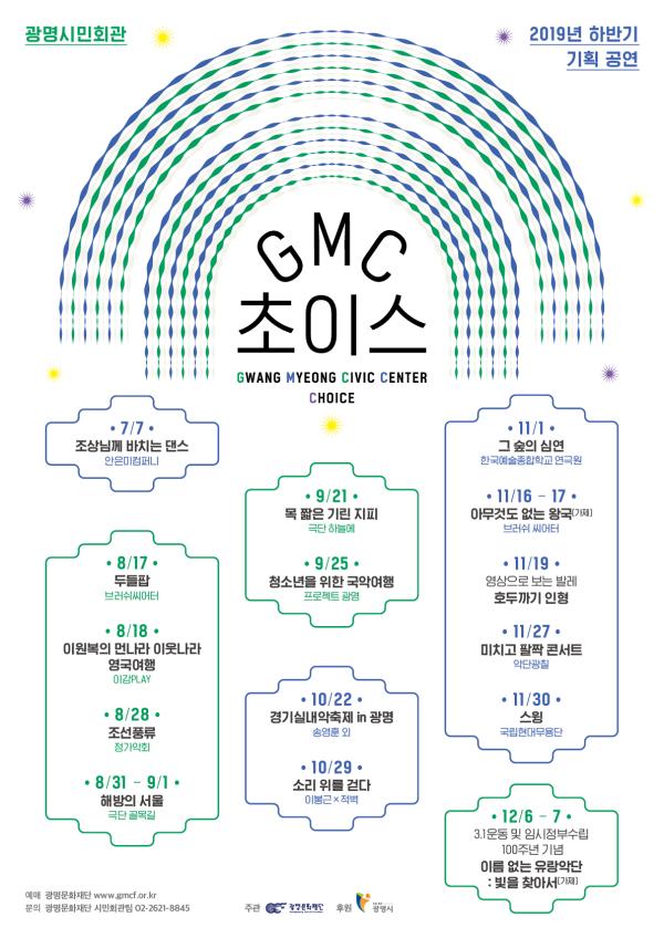 광명문화재단은 2019년 광명시민회관 하반기 기획 공연 ‘GMC 초이스’를 지난 7일부터 오는 12월 7일까지 광명시민회관 대공연장에서 총 15개 작품, 22회 선보인다고 밝혔다.