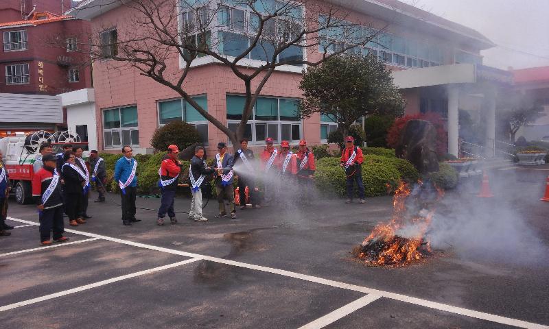 거제시 둔덕면(둔덕면장 김형호)에서 지난 4월 27일에 이번 4월을 끝으로 둔덕면 내의 산불 일반감시원들의 근무가 종료됨에 따라 혹시 모를 산불 발생을 우려하여 둔덕면 내 각 민방위 대장, 주부 민방위 대장 그리고 기관단체장들과 함께 산불 진화 훈련을 실시했다.