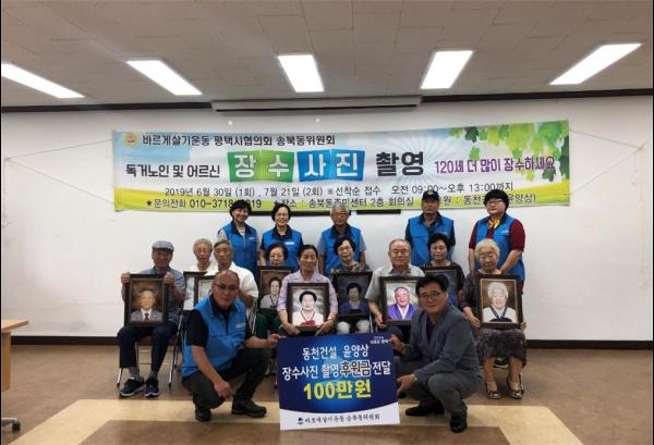 윤양상 위원은 지난 1차 후원금 기부에 이어 2차 후원금까지 총 200만원을 기부했으며, 장수사진은 독거 어르신의 무병장수를 기원하는 바르게살기운동 송북위원회의 봉사활동으로 현재까지 210여명의 어르신들이 사진을 찍었다.