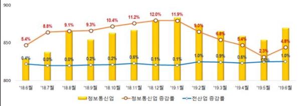 과학기술정보통신부에 따르면 2019년 6월 정보통신업 취업자는 86만 9천명으로 전년 6월 대비 4만 명 증가했고 18개월 연속 증가세를 기록했다.