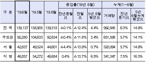 2019년6월 수도권 거래량은 전년동월 대비 0.4% 감소, 지방은 0.4% 증가한 것으로 나타났다.