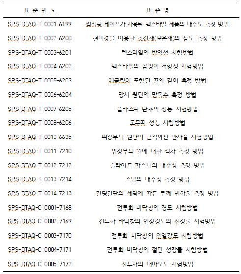 대표적으로 투습방수 기능성 소재 평가를 위한 ‘심씰링 테이프가 사용된 텍스타일 제품의 내수도 측정방법’이나 특수분야에 근무하는 장병 전투복 난연소재의 ‘텍스타일의 방염성 시험방법’과 같은 표준을 자체적으로 개발해 적용했다. 특히 최근 이슈화된 ‘불에 약한 전투복’과 같은 일반 전투복을 착용한 병사가 다양한 외부 위험으로부터 최소한의 생존성 확보가 가능한도록 다양한 시험방법을 개발해 단체표준으로 등록을 추진 중에 있다.