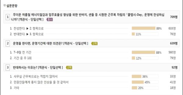 지난 8일부터 12일까지 실시한 전 직원 설문조사에서 89%의 높은 찬성을 얻은 이번 캠페인은 전 기간 반바지, 샌들 등 시원한 쿨맵시 복장 착용을 허용한다. 다만, 단정하지 못하거나 지나치게 개성적인 복장은 제외하고, 공식적 행사나 민원업무 등을 고려해 부서 여건에 맞게 자율적으로 추진할 방침이다.
