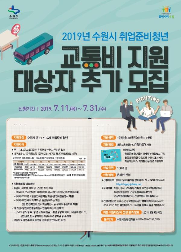 선정자는 8월 9일 개별적으로 알려준다. 자세한 내용은 수원시 홈페이지 ‘시정소식’에서 ‘취업준비청년 교통비’를 검색해 확인할 수 있다.