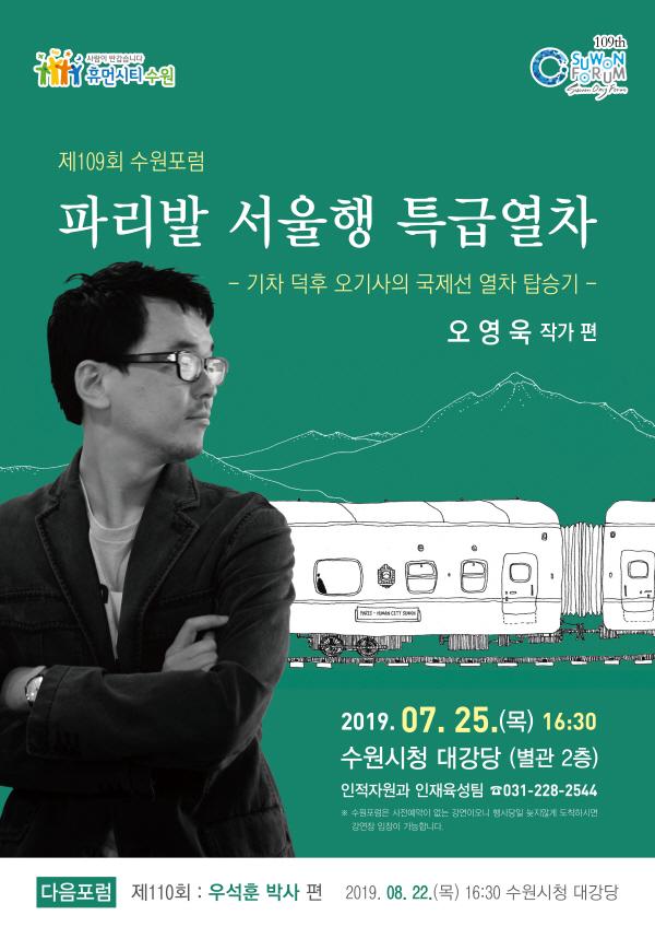 수원시는 오는 25일 오후 4시 30분 시청 대강당에서 ‘파리발 서울행 특급열차’를 주제로 109번째 수원포럼을 연다. 오영욱 작가가 강연자로 나선다.