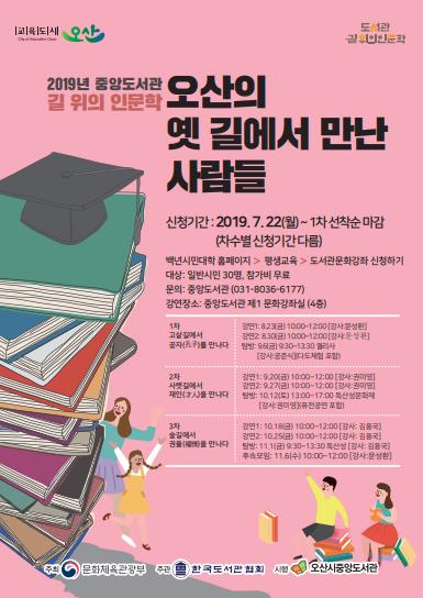 오산시 중앙도서관은 문화체육관광부가 주최하고, 한국도서관협회가 주관하는 “2019년 길 위의 인문학”공모사업에 선정돼 오는 8월부터 11월까지 강연 및 탐방 프로그램을 진행한다.
