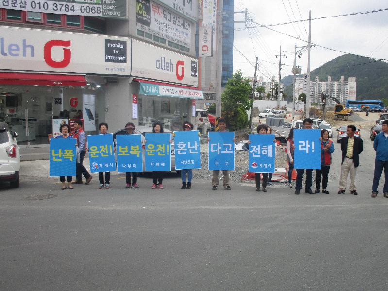 이날 캠페인은 최근 사회적 문제로 대두되고 있는 보복 운전, 스쿨존에서의 교통사고 근절과 선진 교통 문화 인식 제고를 위해 『거제시 나부터 다함께 시민운동본부』 소속 19개 지부 합동으로 실시되었으며, 지부 회원들이 교통 법규 준수, 양보 운전, 어린이 보호 등 교통안전 구호 선창과 교통 안전 피켓 홍보를 병행하여 1시간 동안 진행되었다.