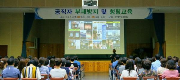 지난 19일 1,2부로 나뉘어 진행된 교육에는 강은미 강진다산수련원 청렴교육 전문 교수가 '진정성 리더쉽을 통한 행복한 청렴성장’이라는 주제로 공무원 행동강령, 갑질, 부패공직자 사례로 본 청렴가치와 청탁금지 유형별 사례들을 소개했다.