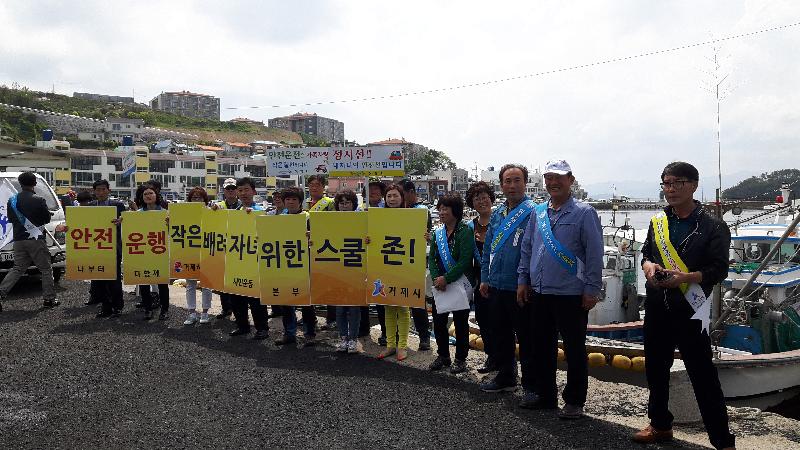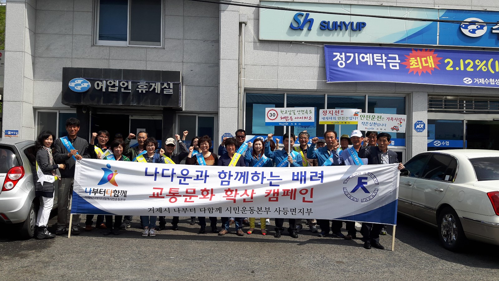 이날 캠페인은 거제수협 성포위판장 경매가 이루어지는 오후 2시에 성포위판장을 찾은 시민들을 대상으로 카드섹션 및 피켓 등을 활용하여 교통법규 준수에 대한 인식 개선 및 사회적 관심을 유도했다.