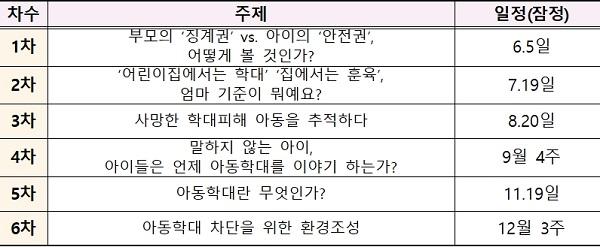 각 주제와 관련된 아동분야 전문가 이해당사자 관계기관 담당자 등을 초청해 아동학대에 대한 인식차이를 확인하며, 서로 간 이해를 바탕으로 그 간극을 좁혀가기 위해 끊임없이 노력할 계획이다.