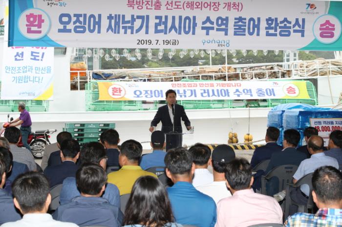 포항시는 지난 19일 북방진출을 선도해 나갈 해외어장 개척을 위해 러시아에 입어하는 오징어 근해채낚기어선들의 안전조업과 만선을 기원하고자 구룡포항에서 선주 및 선원들을 격려했다.