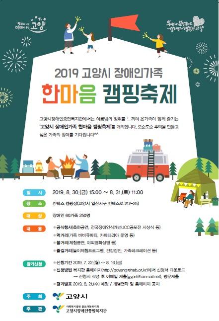 올해로 7회를 맞이하는 ‘2019 고양시장애인가족 한마음캠핑축제’가 고양시 주최, 고양시장애인종합복지관 주관으로, 오는 8월 30일과 31일 양일간 킨텍스 캠핑장에서 진행된다.