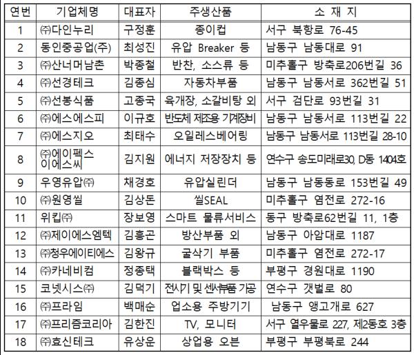 인천시는 인천소재 제조업, 지식기반서비스업, 마이스산업 관련 중소기업을 대상으로 2017년 대비 2018년 근로자 증가 인원이 5명 이상이고, 근로자 증가율 5% 이상인 기업을 지난 3월부터 5월까지 공모해 일자리 성장성과 안정성 등에 대한 서류심사와 현장 실사를 거쳐 18개 기업을 일자리창출 우수기업으로 선정했다.