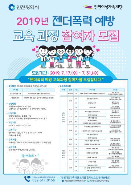 인천광역시여성가족재단은 성평등 관점에서 젠더폭력 예방교육을 수행할 수 있는 전문 강사를 발굴하고 양성하기 위해 ‘젠더폭력 예방 교육과정’ 참여자를 모집한다.