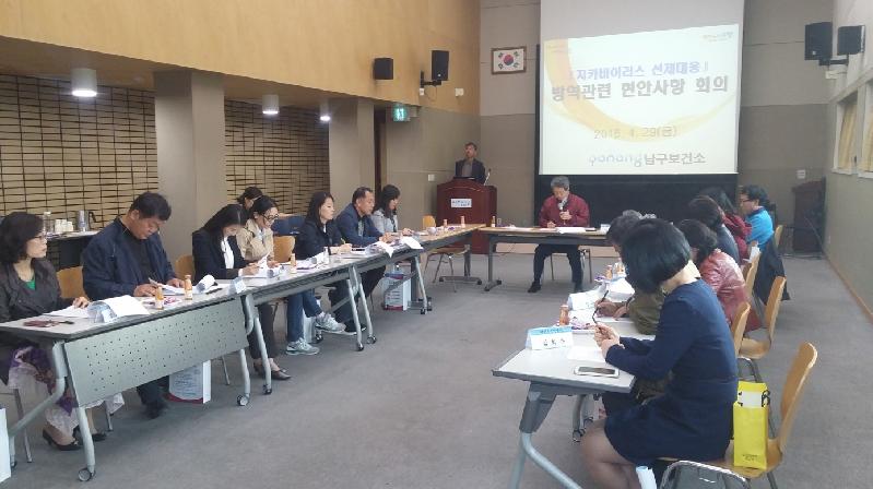 포항시 남구보건소는 지난 4월 29일 읍면동 방역업무 담당자와 현안사항 회의를 가졌다. 이날 회의는 최근 식당과 경로당에 모기, 깔다구 등 위생해충 출현으로 민원 발생함에 따라 마련된 것으로 현안사항과 향후 추진계획에 대해 심도 있는 논의가 이뤄졌다. 회의 주 내용으로는 방역민원시 읍면동 방역요원과 보건소 방역반이 상시 비상연락망을 유지하면서 적극적인 자세로 공동 대처하기로 하고, 야간ㆍ휴일 민원발생시 당일처리를 원칙으로 비상근무체계를 유지하기로 힘을 모았다. 이외에도 방역요원 근무수칙 배부, 안전사고, 작업자 약품희석배율, 소독중 중독증상 발생시 대처 방법, 개인 보호장비 착용 등을 재강조 했다. 남구보건소는 매주 수요일 16시부터 18시까지 보건소, 읍면동 일제방역의 날로 지정 추진하고, 하반기 읍면동 평가시 방역소독 활동의 충실도를 평가 항목으로 넣어 방역업무의 중요성을 높일 계획이다. 고원수 보건관리과장은 회의를 주재하면서 “금년에는 모기가 지카바이러스를 옮기는 매개체인 만큼, 철저한 방역소독활동만이 바이러스의 토착화를 막는 최선의 길”이라고 강조하면서 “시민들이 쾌적한 공간에서 생활하는데 방역담당 공무원의 역할이 무엇보다 중요하다.”고 말했다.