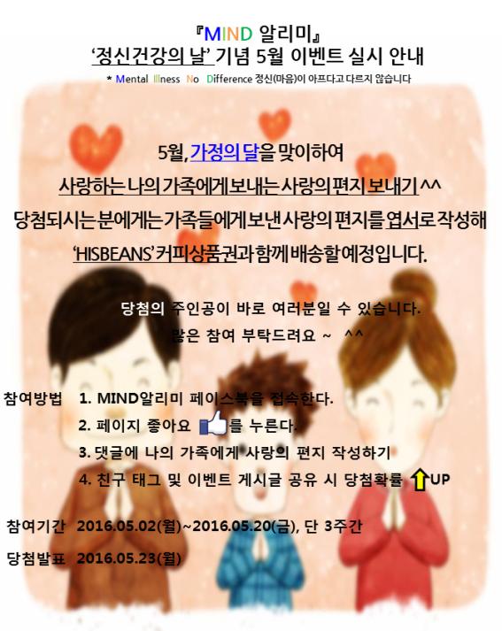 포항북구정신건강증진센터는 이달 2일부터 20일까지, 3주간 정신건강 MIND(Mental Illness No Difference)알리미 5월 이벤트를 실시한다. 2014년 경상북도 정신보건 실태조사에 따르면 포항시의 경우 ‘정신건강 관련 도움이 필요하다고 느낀 경험이 있다’에 응답한 대상자는 총 157명 중 23명, 14.6%를 차지하나 23명 중 정신건강 관련 도움 받은 경험이 있는 사람은 0명으로 23명 모두 ‘정신건강 관련 도움을 받은 경험이 없다’고 응답했다. 이 중 도움을 받지 못한 이유로 정신건강 서비스 제공기관 부재(21.7%), 정신과적인 치료를 받는 것에 대한 두려움(21.7%)이 각각 순위에 올랐다. 이에 북구정신건강증진센터는 포항시 지역주민의 정신건강 서비스 접근성 및 이용률을 향상하고자 정신건강「MIND알리미」프로젝트를 실시하고 있다. 프로젝트의 일환으로 페이스북 ‘MIND알리미’ 페이지 개설을 통해 매월 다양한 이벤트 및 정신건강정보를 제공하고 있으며, 이벤트 상품으로 제공되는 상품 중 ‘커피교환권’의 경우 정신장애인들이 바리스타로 실제 근무하고 있는 ‘히즈빈스’의 후원을 받고 있는 등 지역주민의 정신건강을 위해 힘을 보태고 있다. 박혜경 북구보건소장은 “실제로 도움이 필요하지만 정보의 부재 및 사회적 편견으로 적절한 서비스를 받지 못하는 사람들이 많다”며 “정신건강 MIND알리미 프로젝트를 통해 지역주민들에게 정신건강에 대한 올바른 정보를 제공하고 서비스 접근성 및 이용률을 높이는데 힘쓰겠다”고 말했다. 한편, 정신건강「MIND알리미」이벤트 참여를 원하시는 분들은 페이스북 검색창에 ‘MIND알리미’ 검색을 통해 참여할 수 있으며, 페이스북 페이지에서는 정신건강과 관련된 다양한 정보를 함께 볼 수 있다. 기타 자세한 사항은 북구보건소 정신건강증진센터(270-4194~8), 홈페이지(http://mhealth.ipohang.org/)로 문의하면 된다.