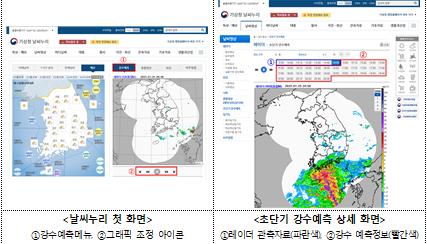 초단기 강수예측정보는 기상청 날씨누리와 모바일 웹에서 이용 할 수 있으며, 날씨누리 첫 화면의 영상 부분과 ‘날씨영상 ’ 초단기 강수예측’에서 확인할 수 있다.
