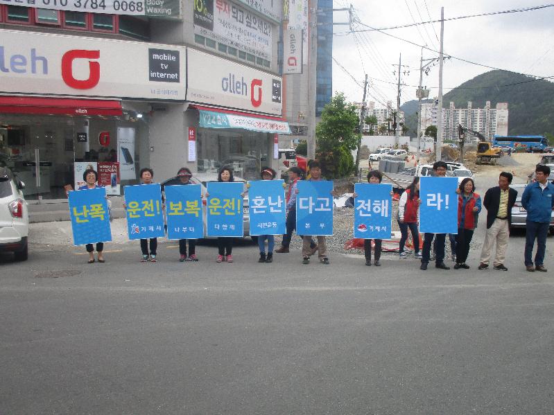 이날 캠페인은 최근 사회적 문제로 대두되고 있는 보복 운전, 스쿨존에서의 교통사고 근절과 선진 교통 문화 인식 제고를 위해 『거제시 나부터 다함께 시민운동본부』 소속 19개 지부 합동으로 실시되었으며, 지부 회원들이 교통 법규 준수, 양보 운전, 어린이 보호 등 교통안전 구호 선창과 교통안전 피켓 홍보를 병행하여 1시간 동안 진행되었다.