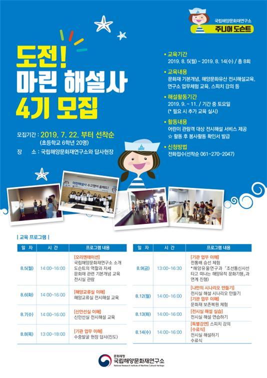 초등학생 6학년을 대상으로 한 ‘도전 마린해설사’는 국립해양문화재연구소 해양유물전시관에서 어린이 눈높이에 맞게 쉬운 해설을 하는 ‘어린이 전시해설사’를 양성하는 프로그램이다.