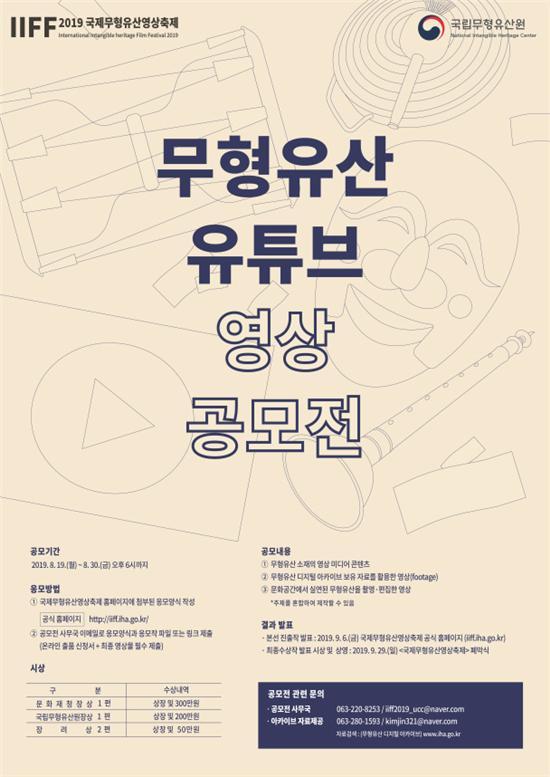 문화재청 국립무형유산원은 무형유산을 널리 알리기 위한 국제무형유산영상축제 프로그램의 하나로 ‘무형유산 유튜브 영상 공모전’을 오는 8월 19일부터 30일까지 공모한다.