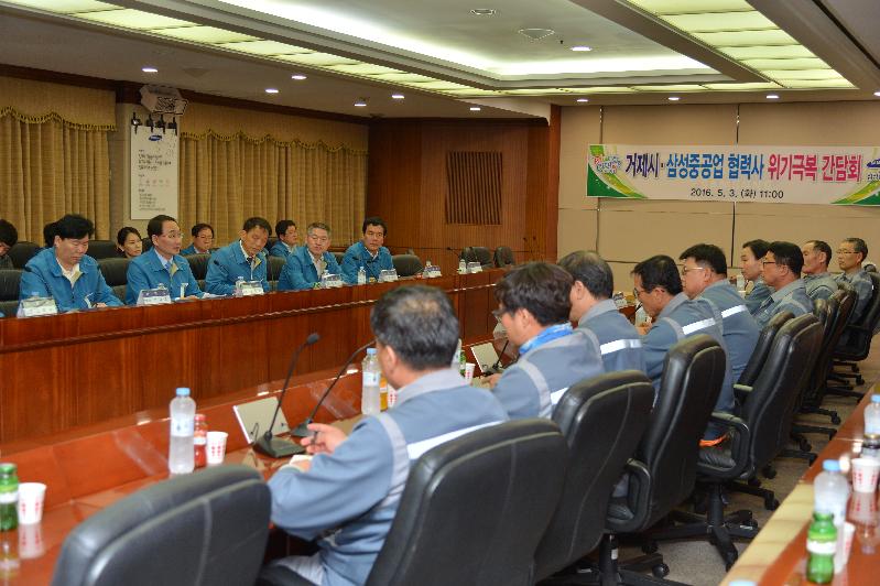 권민호 거제시장은 지난 5월 3일, 저유가와 글로벌 경제위기로 최대의 위기를 맞고 있는 삼성중공업 협력사 협의회 회장단을 찾아 격려하고 조선업계 현장 목소리를 청취하는 시간을 가졌다.