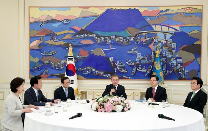 | 왼쪽부터 정의당 심상정 대표, 바른미래당 손학규 대표, 더불어민주당 이해찬 대표, 문 대통령, 자유한국당 황교안 대표, 민주평화당 정동영 대표. |