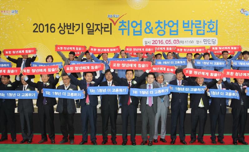 ‘2016 상반기 취업&창업 박람회’가 3일 포항 만인당에서 2,000여명의 구직자와 예비창업가들이 참여한 가운데 열렸다. 최근 철강산업과 조선산업이 어려움을 겪는 가운데 지역의 구직자에게 취업기회를 제공하고 중소기업의 구인난을 덜어주기 위해 개최된 이날 행사에는 포스코외주파트너사를 비롯한 지역의 중견 중소기업 등 67개 업체가 참여했다. 올해 ‘포항 일자리 취업&창업 박람회’에는 구직자를 위한 채용관과 함께 창업관을 운영해 예비창업가를 위한 창업제품전시와 컨설팅은 물론 지역의 성공한 창업가를 초청해 강의를 개최하는 등 창업에 관심이 있는 예비창업자들이 성공적인 창업을 하는데 실질적인 도움이 될 수 있도록 진행했으며, 청년과 중장년, 여성, 장애인, 어르신을 위한 취업상담 및 다양한 정보제공으로 큰 호응을 얻었다. 또, 식전행사로 청년고용 확대를 위한 ‘1사 1청년 더 채용하기 운동 선포식’과 ‘청년일자리 데이’ 협약기관 확대 협약 체결도 함께 이뤄져 기업체 및 유관기관들이 청년일자리창출에 더욱 노력하기로 뜻을 모으는 자리가 됐다. 현장면접에 앞서 경북동부경영자협회에서 행사에 참여하는 구인업체를 대상으로 행사전반에 대한 설명회를 가졌으며, 행사장에 설치된 바리스타체험관, 뷰티체험관, 직업심리검사 및 이력서 증명사진 무료촬영 등 다양한 부대 행사관에는 구직자들의 발길이 끊이지 않았다.