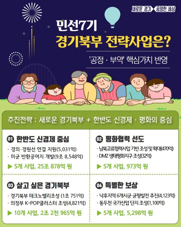 특히 ‘공정’과 ‘억강부약’의 가치를 반영해 ?한반도 신경제 중심 ?평화협력 선도 ?살고싶은 경기북부 ?특별한 희생 특별한보상 등 4개 분야 25개 사업을 추진하겠다는 내용을 담았다.