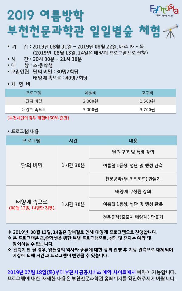 부천천문과학관은 여름방학을 맞아 초·중학생를 대상으로 오는 8월 1일부터 22일까지 매주 화~목요일 8시에 일일별숲 프로그램을 진행한다.