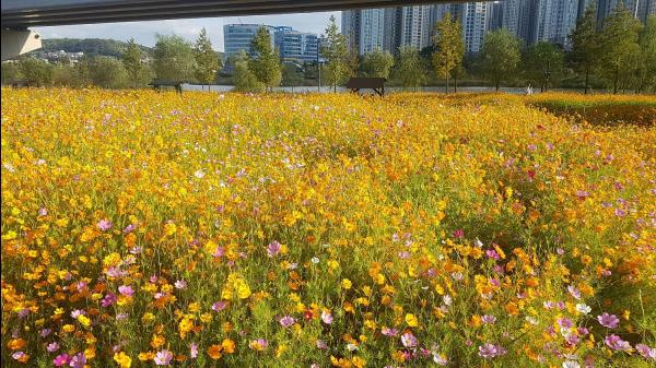 파주시 공원관리사업소는 지난 20일 운정호수공원 공룡폭포 앞 운정꽃마당에 약 1천평 규모로 황화코스모스 꽃씨를 파종했다.