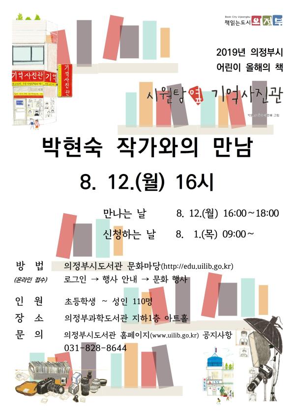 의정부과학도서관은 오는 8월 12일 2019년 의정부시 올해의 책 어린이 분야 ‘시원탕 옆 기억 사진관’의 박현숙 작가와 만난다.