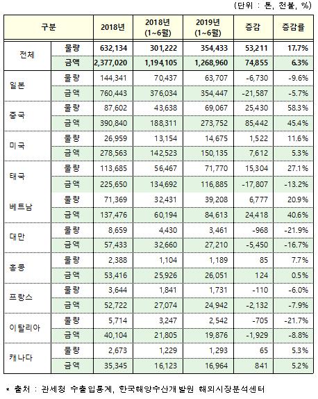 무역갈등이 고조되고 있는 일본의 경우에는 상반기 수출실적이 3.5억 달러로 전년 대비 약 5.7% 감소하였으나, 일본의 수입수산물 검사 강화의 영향은 크게 없는 것으로 파악되고 있다.