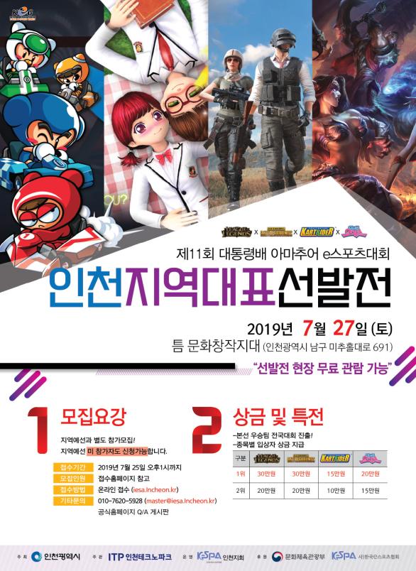 인천광역시는 인천테크노파크와 함께 ‘제11회 대통령배 아마추어 e스포츠대회’에 인천 대표로 출전한 선수를 오는 27일, 주안에 위치한 복합문화공간 틈 문화창작지대에서 개최한다고 밝혔다.