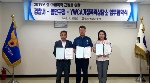 안양동안경찰서에서 진행된 협약식에는 권순일 구청장, 김진태 동안경찰서장, 조미영 안양YWCA 가정폭력상담소장 등이 참석해 협약서를 교환했다.